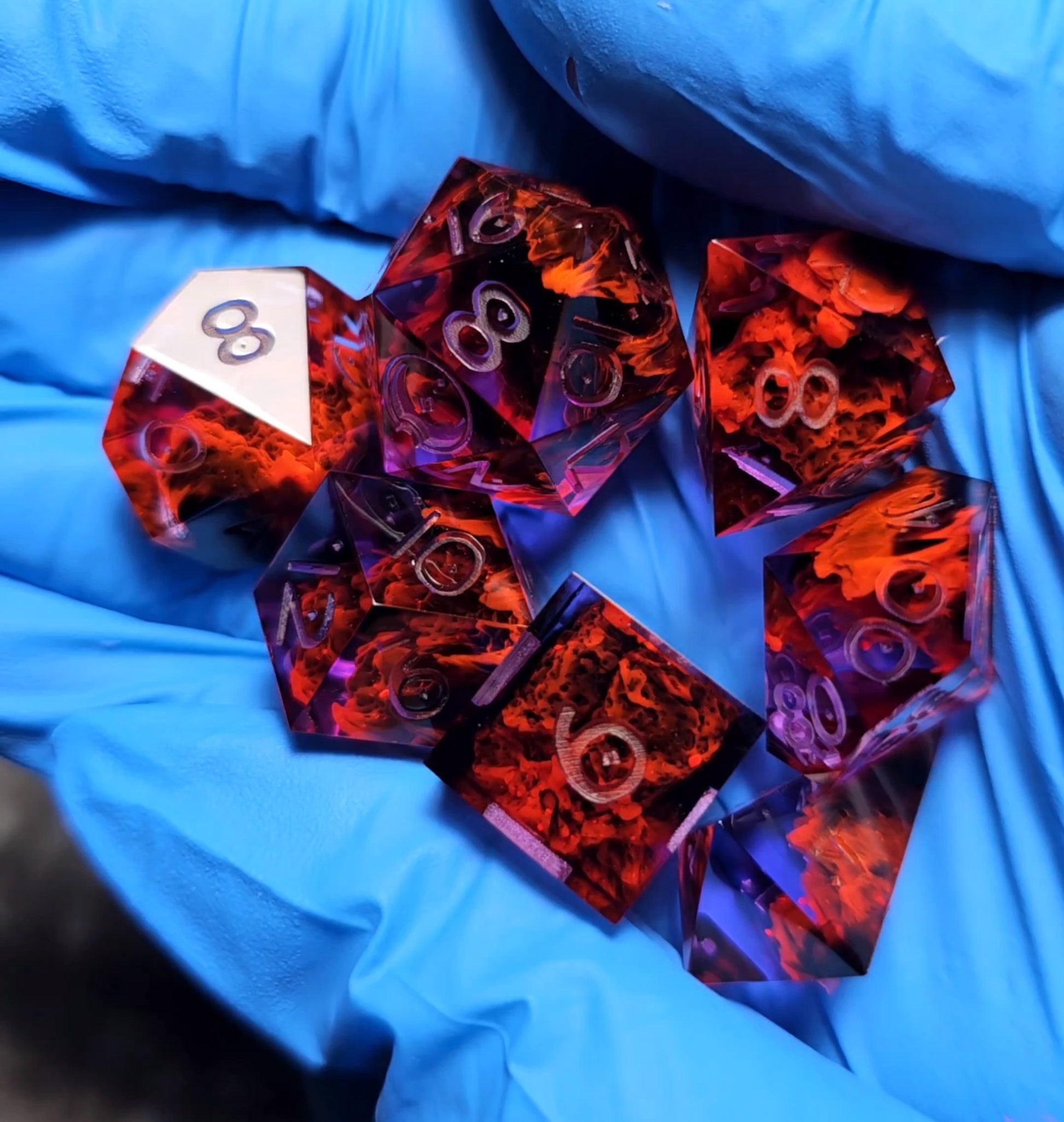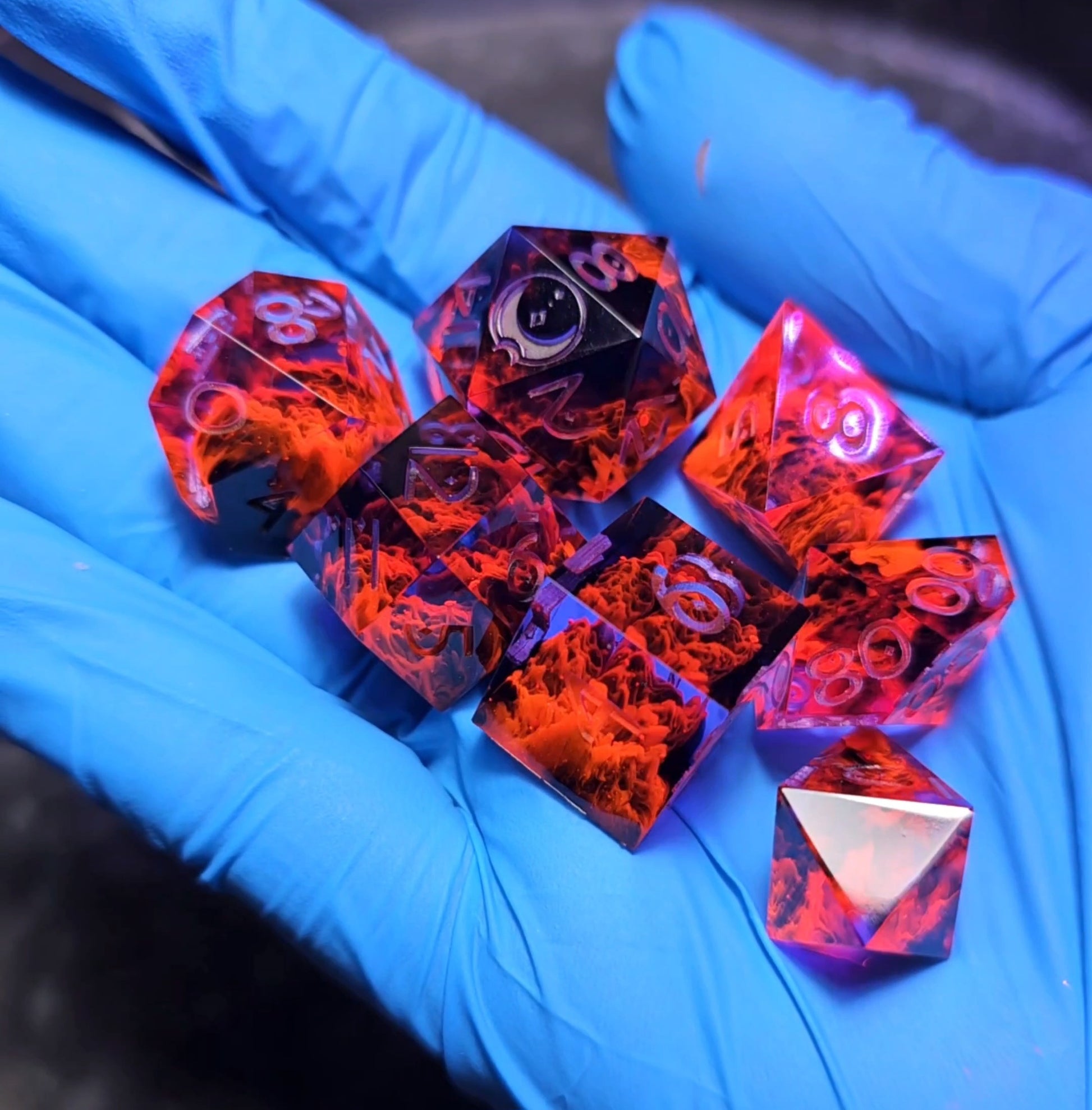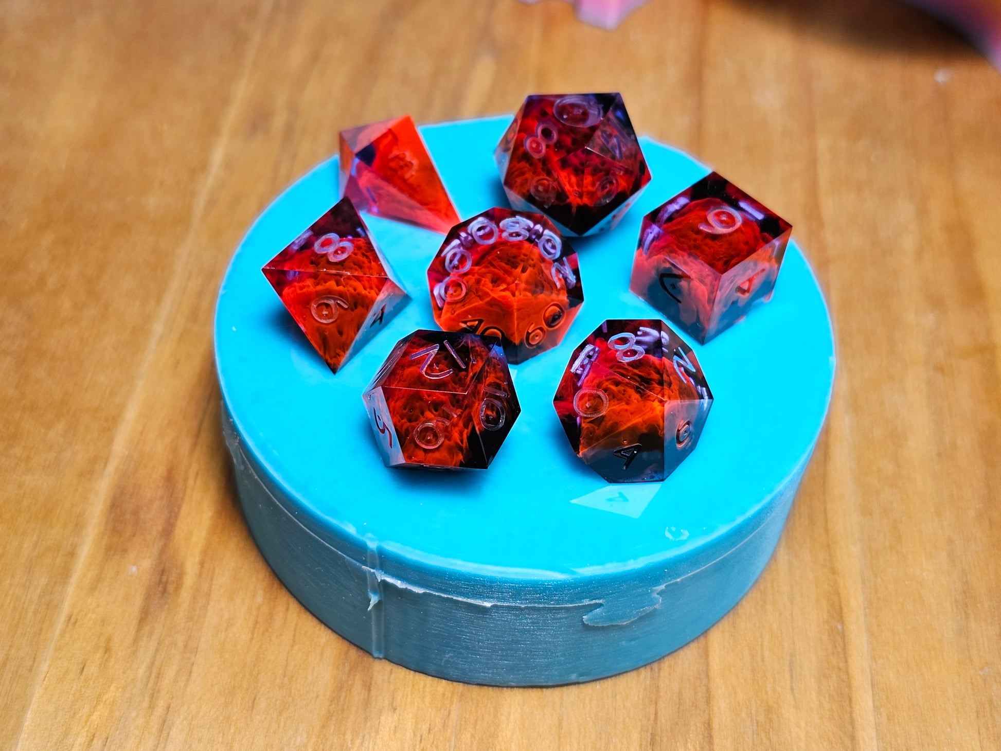 These dice currently only come in their raw form. Which means they are unsanded and uninked (still playable, they just have some rough edges around the lowest faces.) I may offer finished versions at a later date.